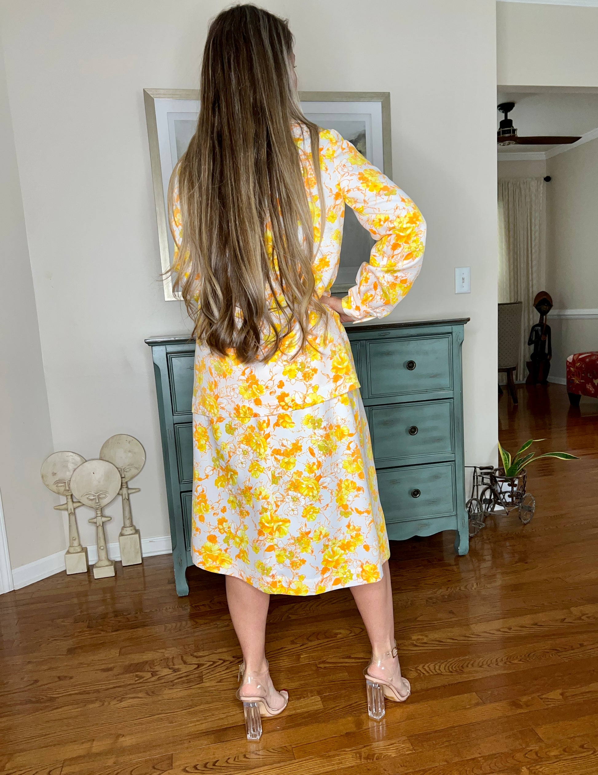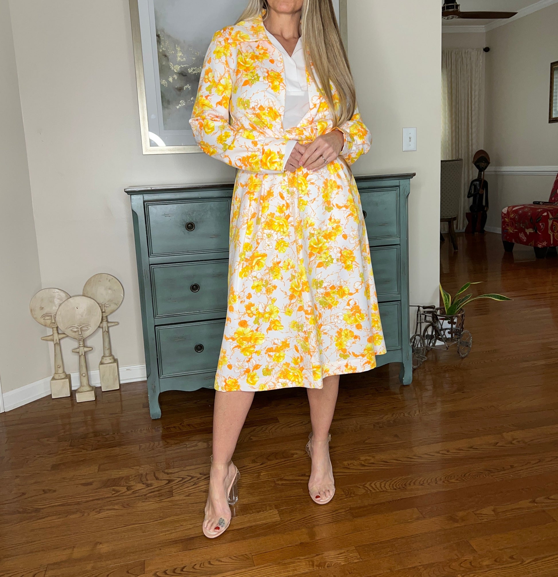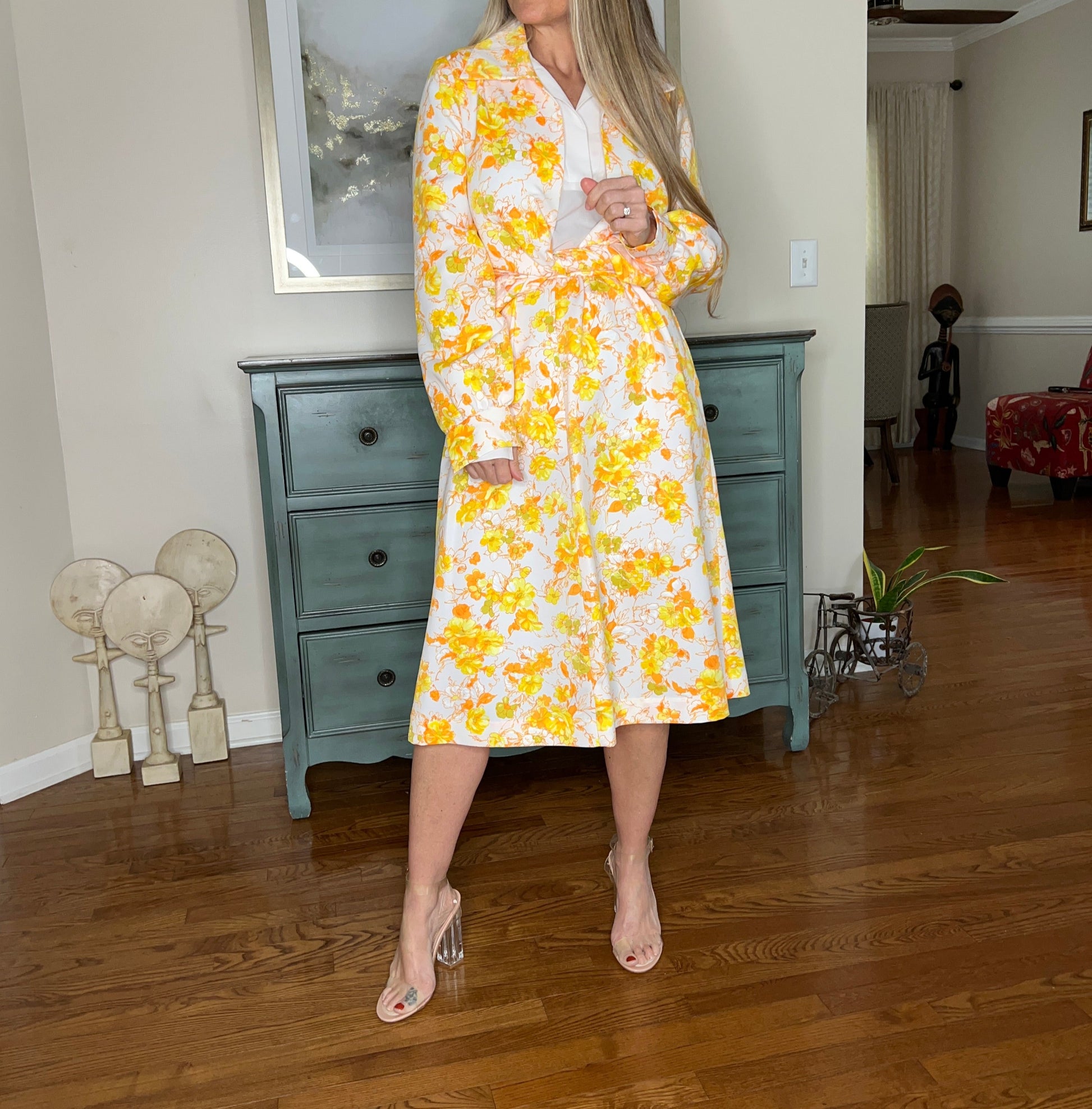 Show stopper 60s-70s two piece set featuring open cardigan and skirt. Skirt has side zipper with hook closure.